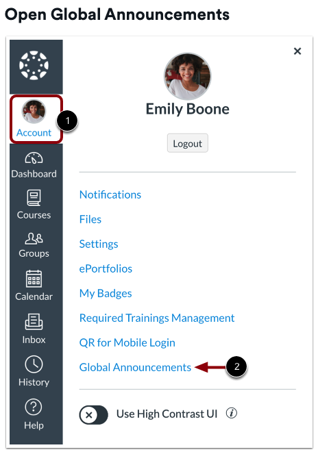 To view these notifications, click Account [1], then navigate to the Global Announcements in the menu [2].