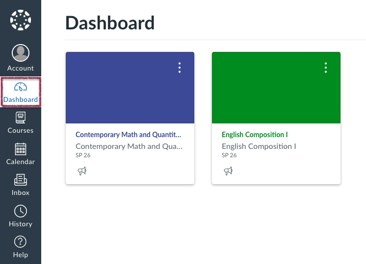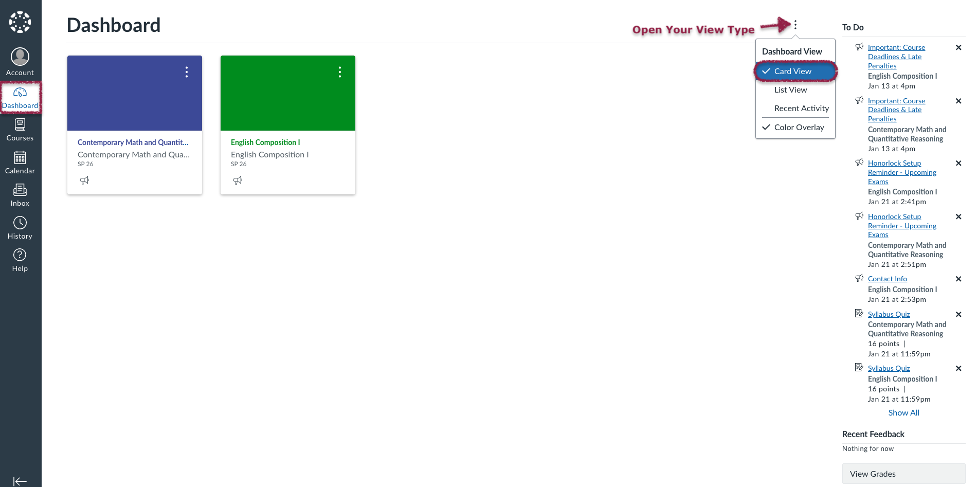 Card View: displays course cards for quick access to all your favorite courses (the same courses display in the Courses link from the Global Navigation Menu) List View: displays all course to-do items in an agenda view